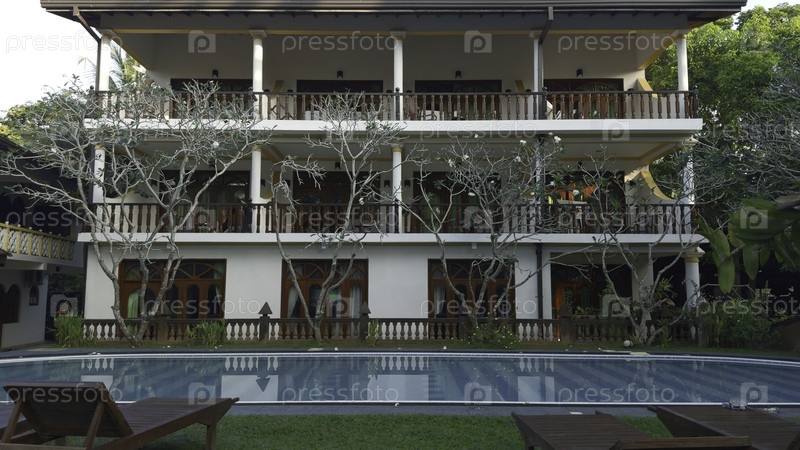 Красивая белая вилла с бассейном. Действие. Прекрасный фасад виллы с бассейном на курорте в тропиках. Аренда виллы или квартиры с бассейном на отдыхе в тропике