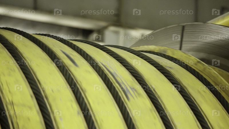 На выставке представлены катушки желтого резинового шланга, демонстрирующие промышленное хранилище, наполненное оборудованием