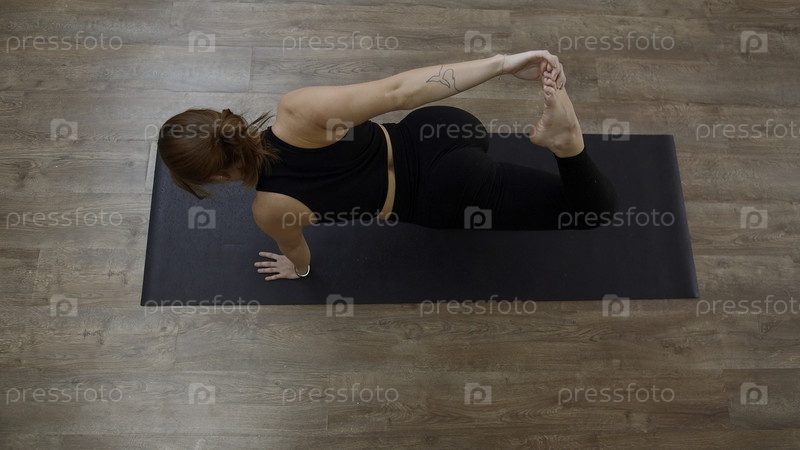 Красивая белая женщина занимается фитнесом на коврике дома СМИ Вид сверху девушки, выполняющей упражнения