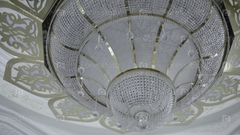 Красивый потолок и большая люстра в мечети. Сцена. Интерьер мусульманского места, удивительная исламская архитектура