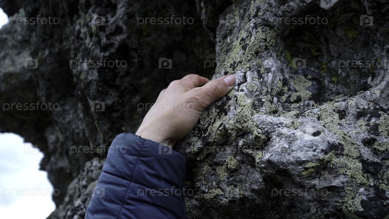 Природа, прикосновения и скалы с женщиной рукой ощущение текстуры, поверхности или местности горы. Клип. Путешествия, походы и экология с женской ладонью на камне