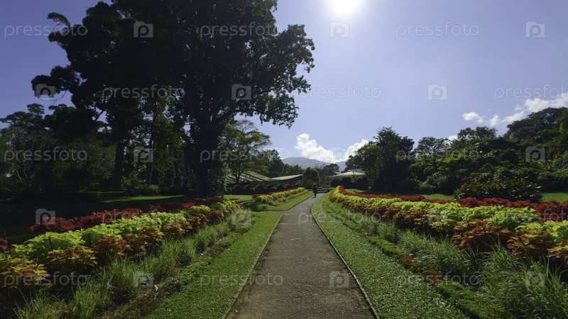 Красивая тропа с аккуратными красочными кустами. Действие. Прекрасный вид на тропу с цветными кустами и яркой зеленью в солнечный день. Красивый парк с цветками и кустарниками в солнечный летний день