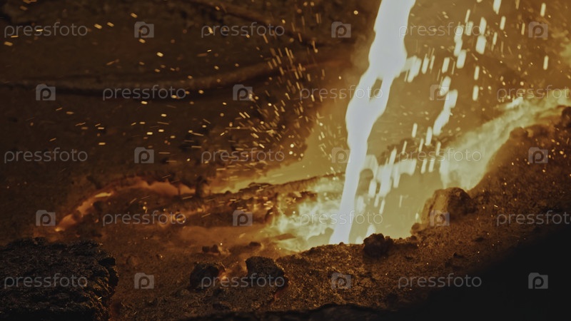 Движущийся поток расплавленного металла. Скриншоты из фильма. Расплавленный металл или лава движется в русле реки. Поток горячей жидкости с брызгами