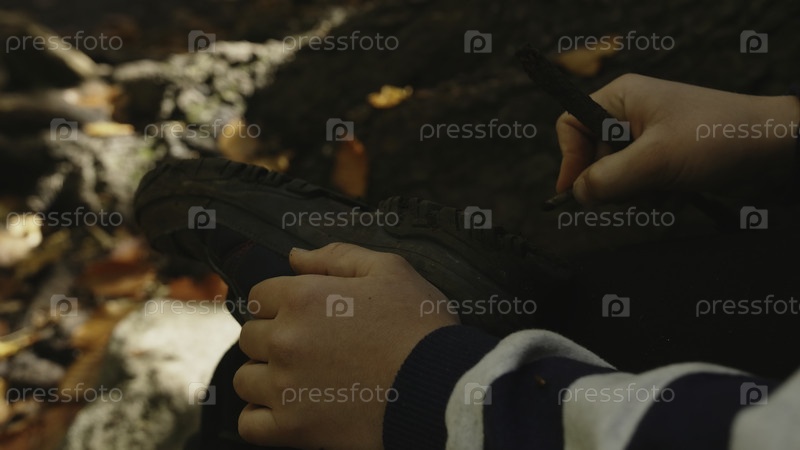 Человек чистит обувь в лесу.Креативность. Близкий человек очищает подошву обуви в лесу.Человек подбирает подошвы камней во время похода по осеннему лесу