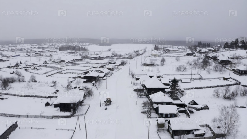 Вид с воздуха снежно покрытых крыш деревянных домов. Клип. Небольшая зимняя деревня на фоне тяжелого облачного неба