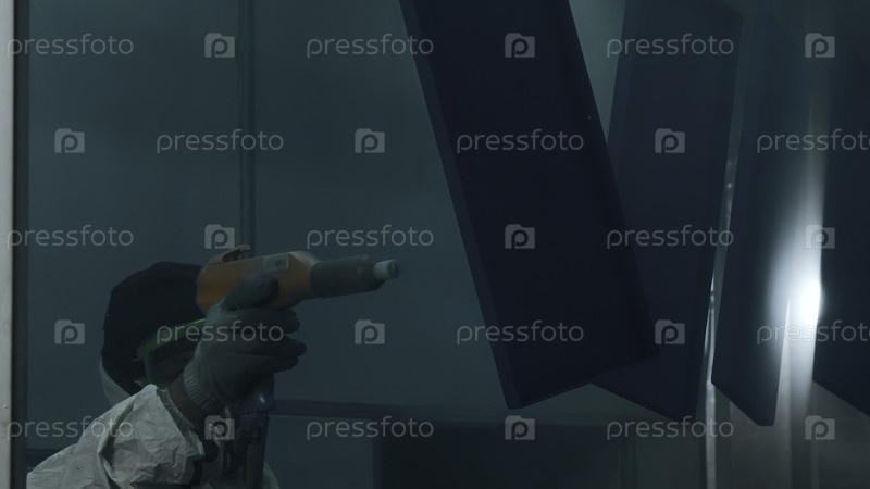 Работник на фабрике рисует металлические детали с пистолетом порошкового покрытия.Креативность.Индустриальная живопись металлопокрытие, процесс производства краски