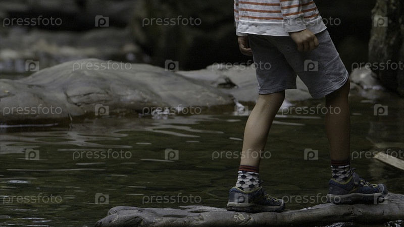 Ноги юноши-подростка в спортивной одежде на скале над рекой