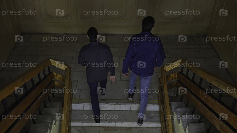 Искусство перил внутри здания классической архитектуры СМИ Молодые люди, поднимающиеся по лестнице