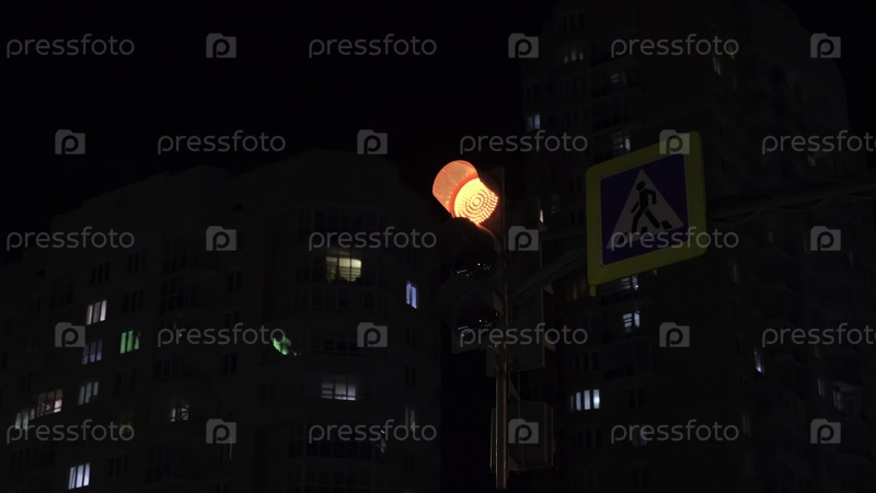 Переключение светофора на ночном перекрестке в городе. Концепция. Изменение светофоров для автомобилей в ночном городе. Светящийся светофор меняет огни на пересечении ночью города