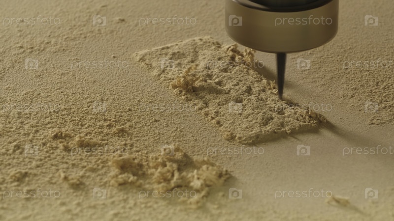 Клюбовое изображение машины для рисунков на дереве.Креативное.Промышленная машина с режущей иглой на поверхности деревянной доски.Автоматизированная машина вырезает узоры на древесине