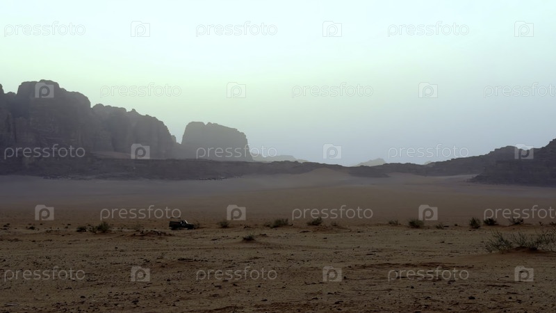 Спокойный и живописный вид на обширный пустынный пейзаж, демонстрирующий скалистые образования под туманным небом