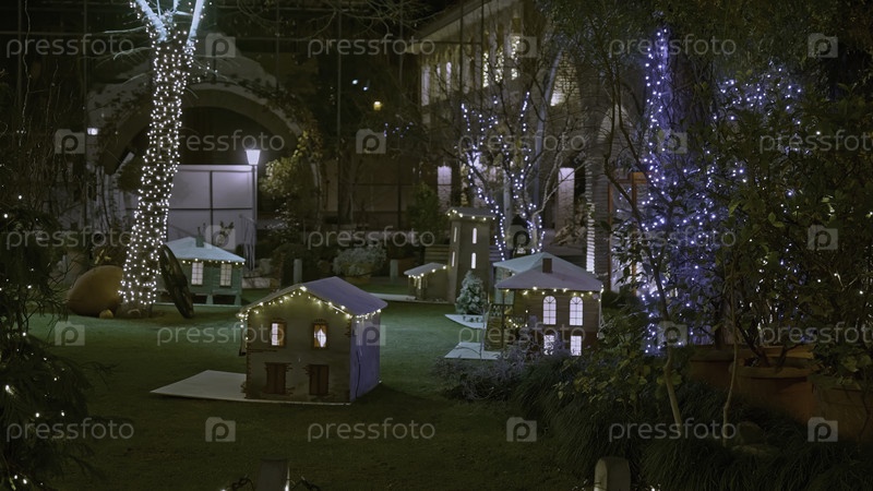 Красивый декорированный задний двор с деревьями, украшенными гирляндами