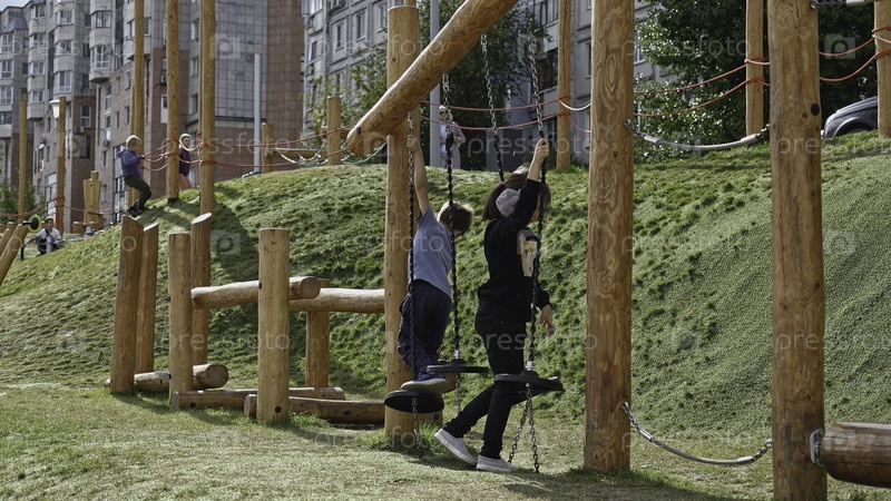 Дети играют на детской площадке рядом с домом.Клип.Дети играют на современной деревянной игровой площадке.Древесная игровая площадка, где дети играют возле домов