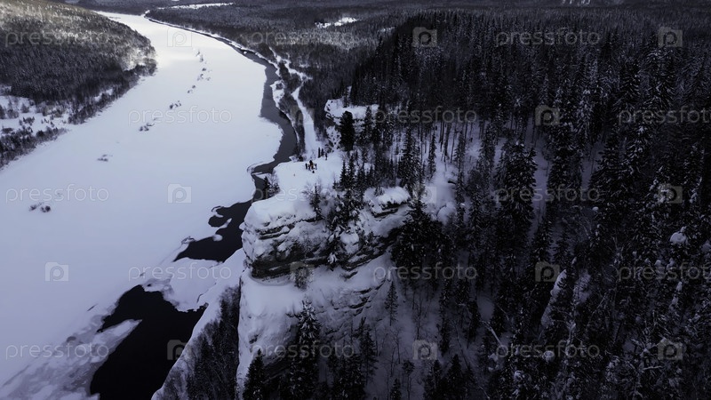 Кинематографическая эпическая воздушная сцена группы лыжников и пешеходов на вершине горы. Клип. Зима на скальном пике на фоне замерзшей реки, леса и облачного неба