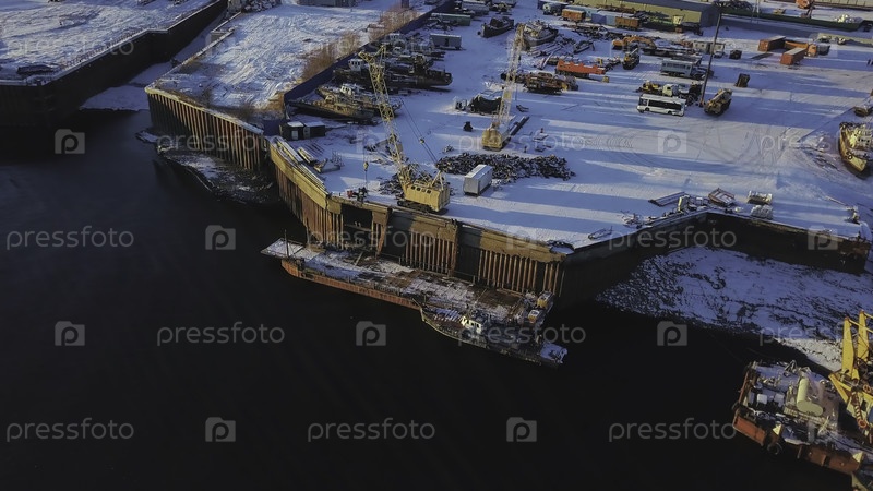 Вид сверху на промышленный водный порт для разгрузки грузов. Клип. Порт с кранами для разгрузки водного транспорта. Берег с портом для разгрузки лайнеров и барж в зимний день