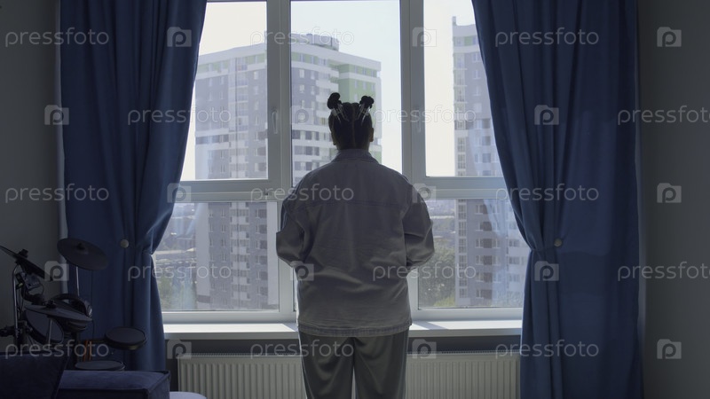 Вдумчивая женщина в пижаме с скучным взглядом из окна.СМИ.Задний вид женщины дома в комнате с голубыми шторами