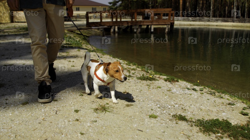 Игровая молодая собака просыпается с хозяином у небольшого пруда
