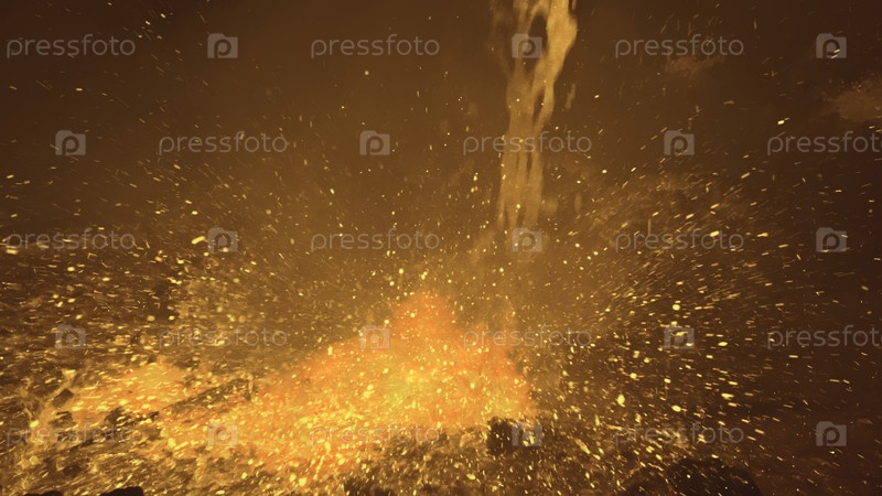 Поток расплавленного металла вливается на фабрику. Фотоаппаратные кадры. Жидкий расплавленный металл заливается брызгами на заводе. Металлургическое предприятие с потоками расплавленных металлов, заполняющими пространство