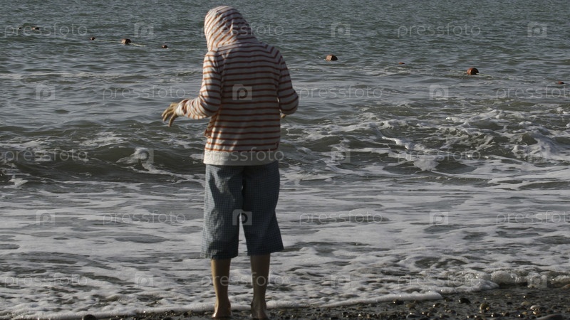 Маленький мальчик, стоящий босиком в воде на галечном берегу.Креативный.Задний вид мальчика, исследующего морской берег