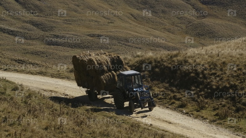 Автомобиль, загруженный стоками сена, проезжает через сельскую местность.Креативно.Солнечный день и долина с растущей травой