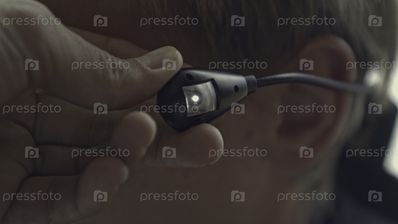 Ближайший снимок мигающего наушника. Сток. Мужчина использует специальные наушники с подсветкой. Человек с наушником для слуха или прослушивания
