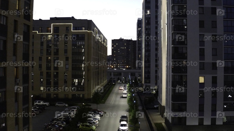 Вид сверху улицы с современными жилыми зданиями. Скриншоты. Красивый вид на современный жилой район города. Светящиеся дома и улицы современного района