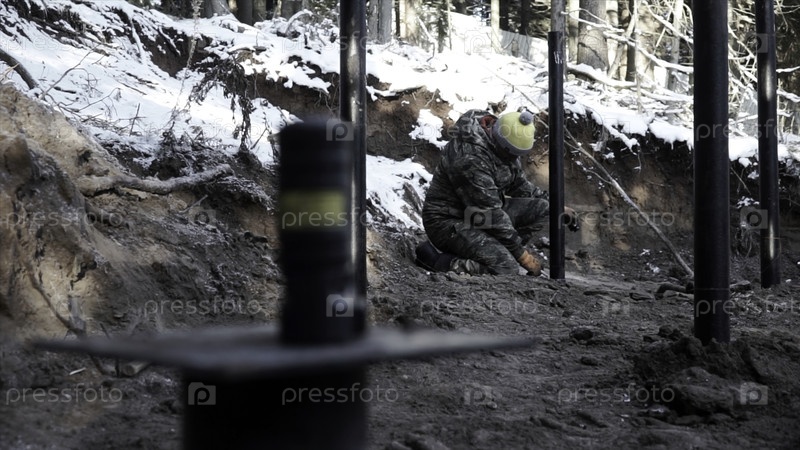 Процесс укрепления почвы с помощью свай на строительной площадке. Клип. Работник на работах по усилению грунтов