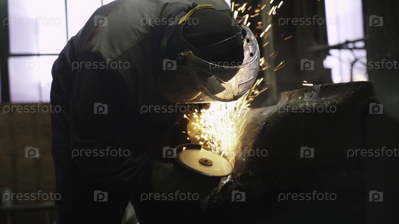 Опытный рабочий выполняет сложную сварку, демонстрируя искры и мастерство в оживленной фабричной среде