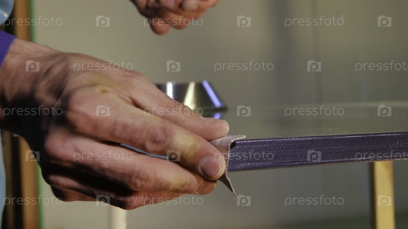 В видео показано, как ремесленник умело обрабатывает стекло, разрезает древесину ножницами и демонстрирует точность и универсальность с различными материалами