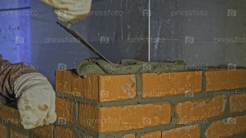 Близкий план мужчин, выкладывающих кирпичную стену в доме. Клип. Процесс прокладки кирпичной стены внутри дома. Строительство кирпичного дома с выложенными стенами