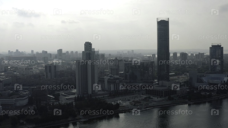 Вид сверху современного серого города в пасмурную погоду. Скриншоты. Серой облачный город с рекой и туманом. Облачные дни, висящие над современным городом