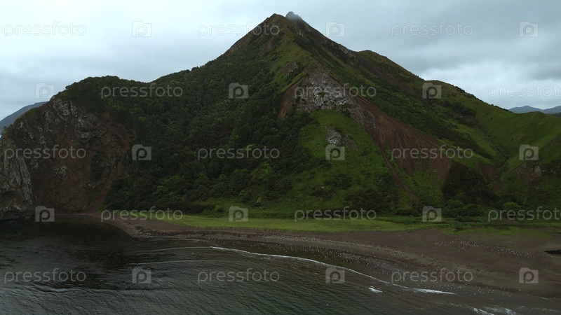Вид сверху дикого побережья со скалистыми горами. Клип. Стадо чайков на берегу океана на фоне удивительных гор