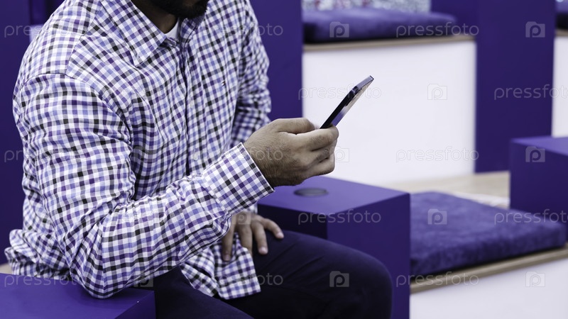 Молодой человек занимается смартфоном, находясь в современном пространстве