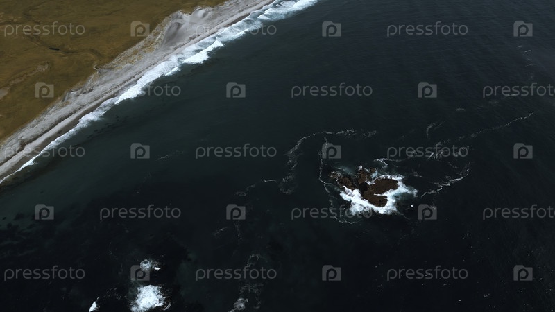 Вид сверху из воздуха волн, разбивающихся на скалах в голубом океане