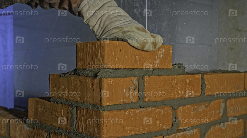 Близкий план мужчин, выкладывающих кирпичную стену в доме. Клип. Процесс прокладки кирпичной стены внутри дома. Строительство кирпичного дома с выложенными стенами
