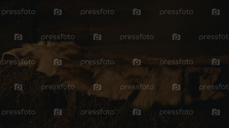 Боковой вид древней соломенной кровати на вершине плиты для теплого сна. СМИ. Старомодные технологии домохозяйства