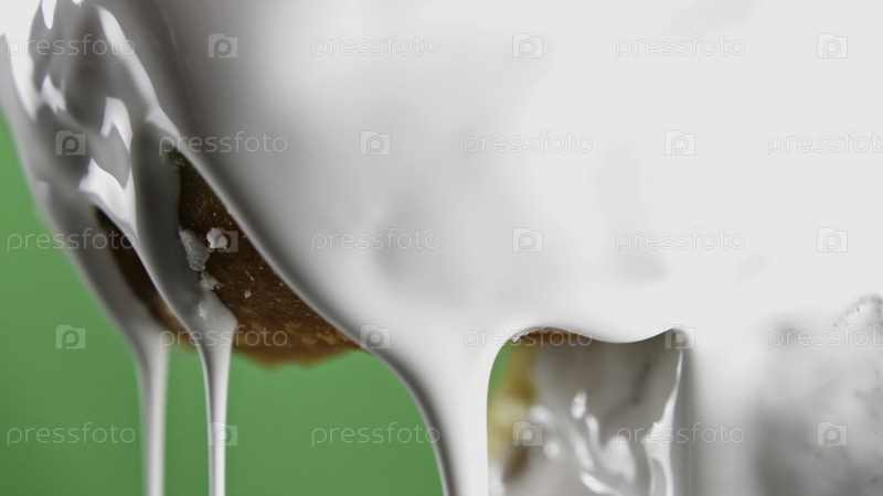 Пончик с капельной белой глазуркой. стоковый клип. ближайшее выпекание с потоком белого сливочного масла. белый крем капает из булочки на зеленом фоне. выпечка и приготовление пищи