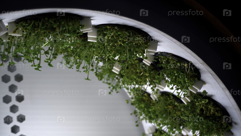 Выращивание микрозеленых растений на небольшой вращающейся ферме со специальным освещением.СМИ.Закрытие выращивания зеленой растительности