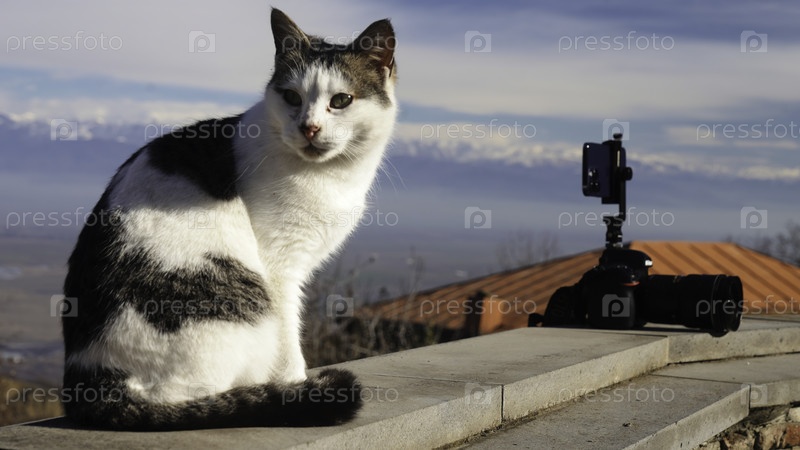 Уличный кот перед камерой. Действие. Красивый вид уличного кота на размытом фоне гор и неба. Уличный кот сидит у камеры
