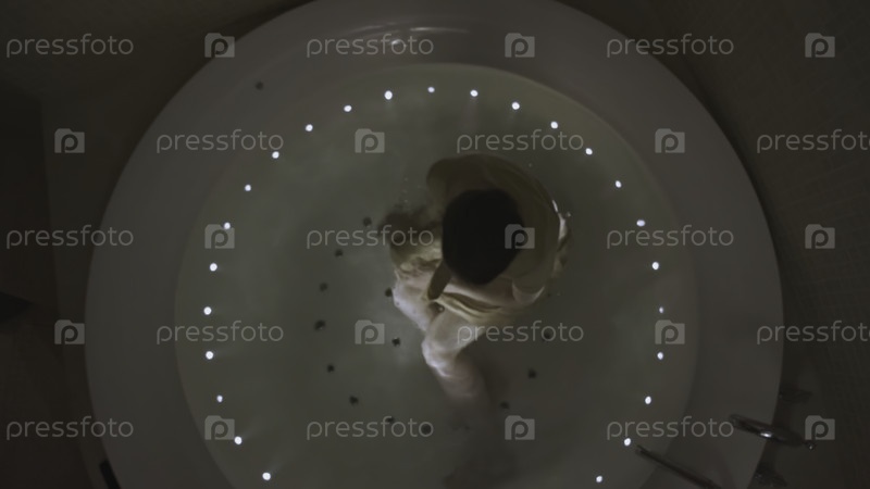 Женщина в халате и джакузи. акции. вид сверху молодой женщины в одежде, ныряющей в ванную комнату. женщина в одежде в цветном джакузи вечером