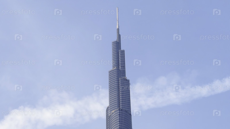 Низкий угол взгляда на Бурдж Халифа с голубым небом позади.Действие.Современный небоскреб со стеклянным фасадом в центре города