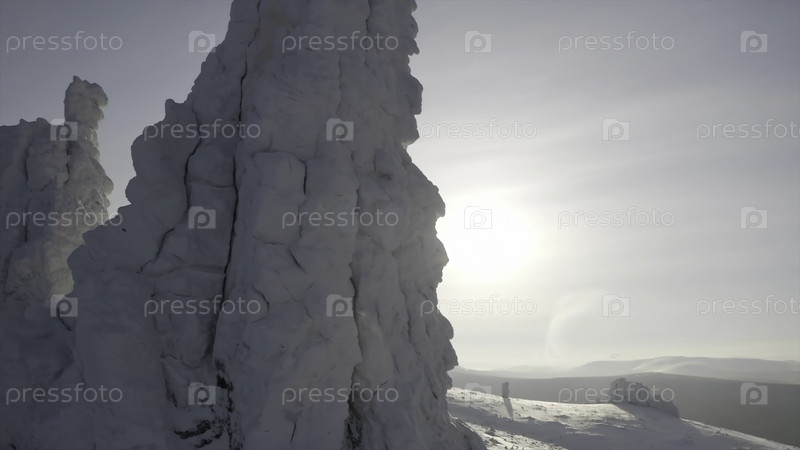 Каменные колонны на фоне зимнего солнечного пейзажа. Клип. Замороженные каменные колонны на фоне яркого зимнего солнца. Удивительные снежные столбы камней на горе в солнечный зимний день
