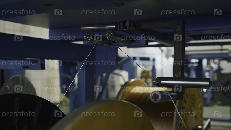 Вращающиеся катушки с проводами на заводе. креативное. распределение и намотка проводов на катушках в металлургическом предприятии. намотка полимерных линий на катушках во время процесса экструзии