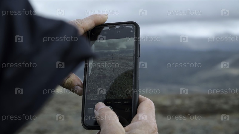 Близкий план человека, фотографирующего горный пейзаж вместе с человеком. Клип. Экран телефона в руках мужчины
