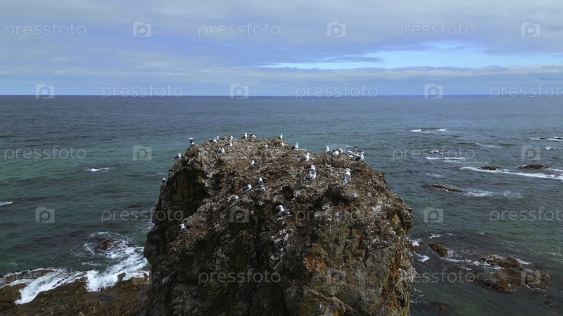Вид сверху скалистых обрывов со чайками на фоне морского пейзажа. Клип. Чайки сидят на вершине скалистой скалы в море. Красивая скалистая скала на северном побережье со чайками на фоне морского горизонта