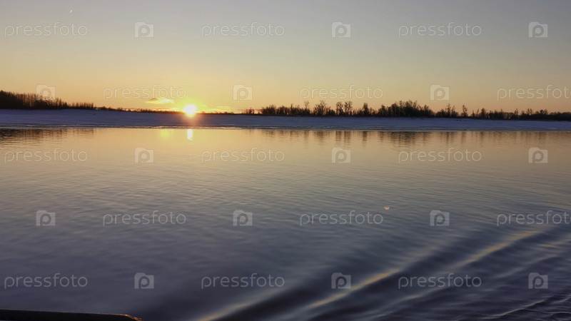 Красивый закат с морской поверхностью и волнениями от плавучей лодки. Клип. Расслабляющий пейзаж с морским закатом и гладкой водой. Лодка плывет на поверхности моря возле снежного берега и красного захода солнца