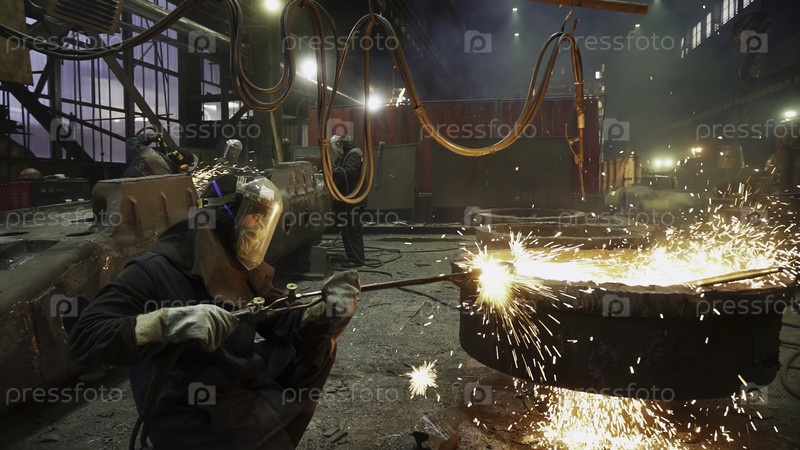 Опытные рабочие умело формируют металлические детали в оживленной, шумной среде промышленного цеха