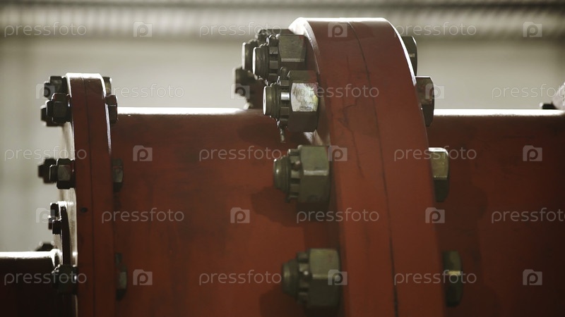 Близкий и подробный взгляд на промышленные машины, в значительной степени демонстрирующие различные красные компоненты и используемые крепежные материалы