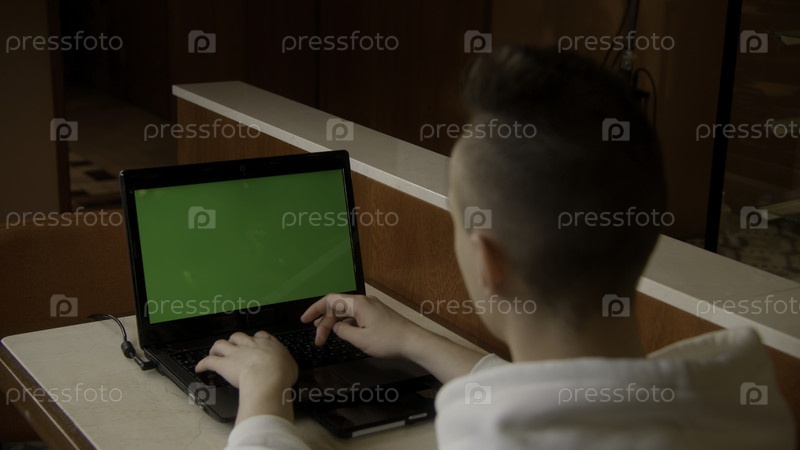Обратный взгляд бизнесмен, работающий на ноутбуке с зеленым экраном. Скриншоты. Молодой человек работает за компьютером со ключом хрома