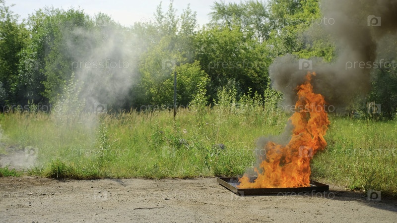 Пожарный, использующий огнетушитель на пламених от горящего подземного сооружения